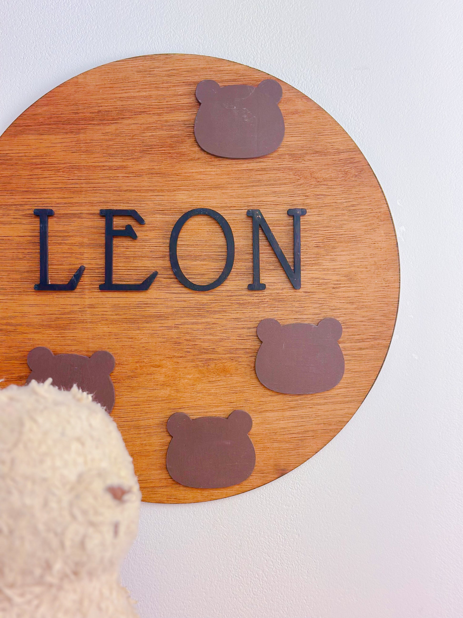Choisissez un cadeau de naissance doux et unique avec ce prénom sur disque pour la chambre de bébé, orné de motifs ourson. Cette décoration murale donnera une touche de tendresse à la chambre de bébé. Une idée cadeau e naissance originale !