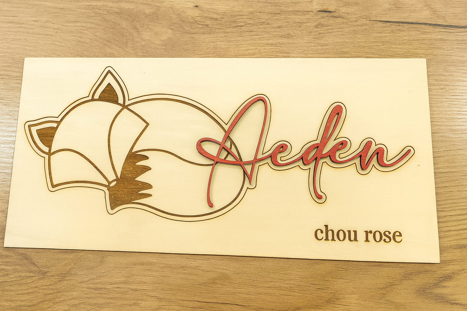 Design en 2 plaques superposées : silhouette de renard + prénom peint en relief